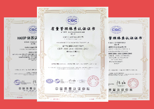 公司順利通過ISO 9001質(zhì)量管理體系認(rèn)證、ISO22000食品安全管理體系認(rèn)證、HACCP體系認(rèn)證